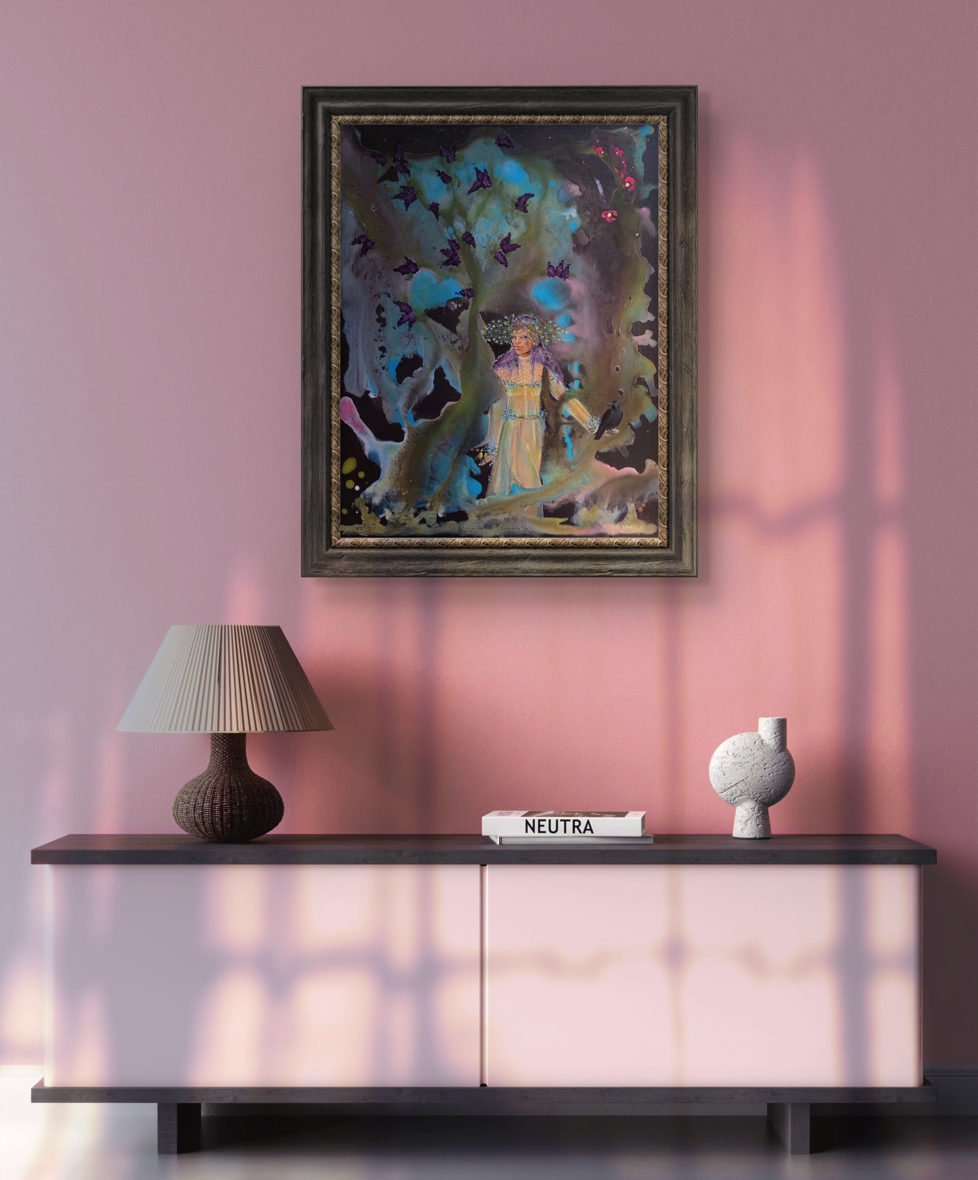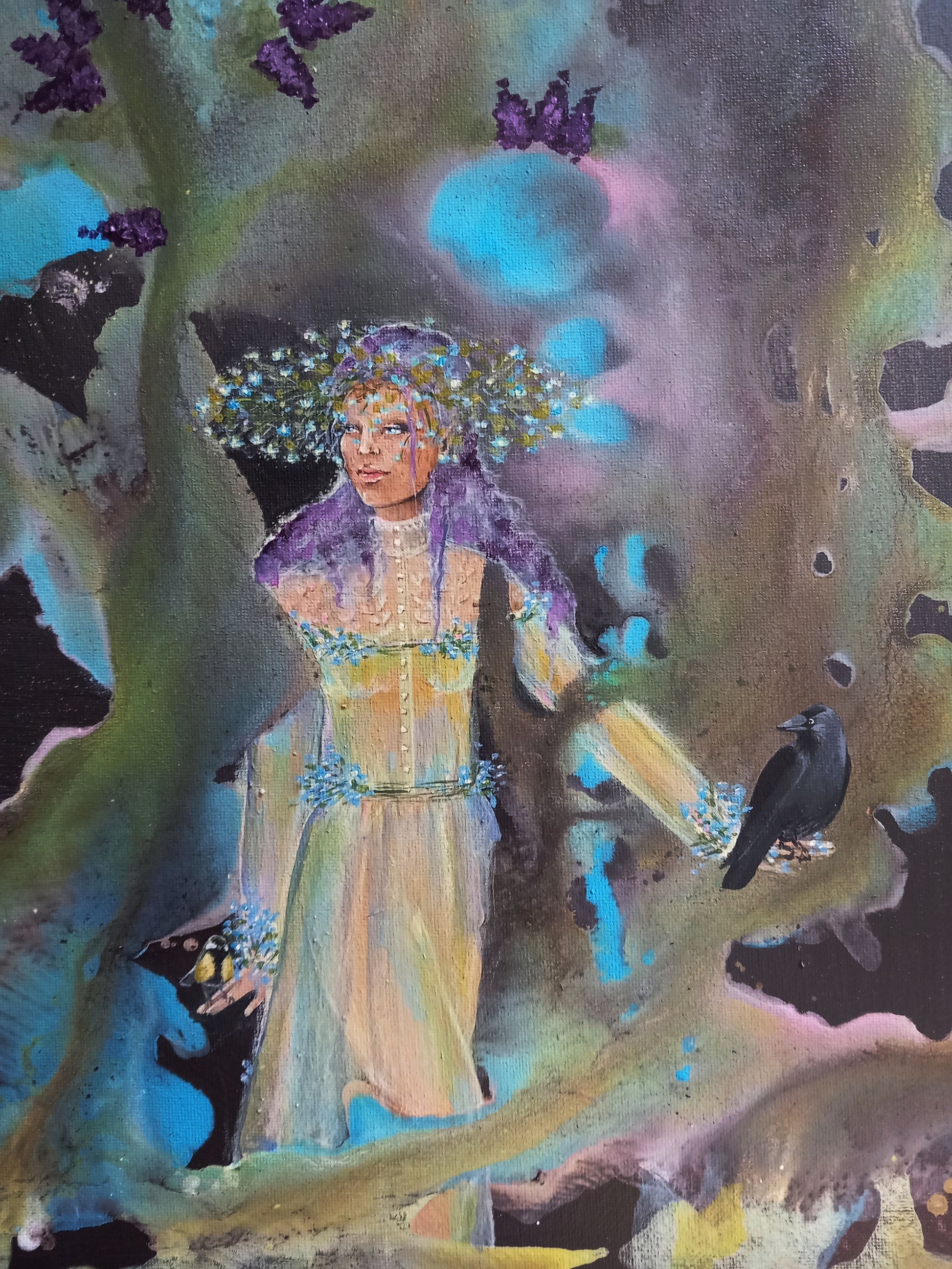 Great Tit and Raven coexist in an enchanting forest scene bathed in dark lilac hues, creating a magical fairy atmosphere. This 50 x 40 cm acrylic painting on canvas captures the mystical relationship between these contrasting birds. Great Tit is a symbol of Love and Raven is your Wisdom.